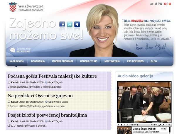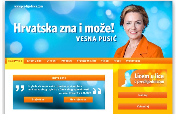 Vesna Pusić odlučila je ponuditi nešto drukčije, pa je osim lukavog odabira domene na kojoj se nalazi stranica (www.predsjednica.com), obukla svoj web u jarko narančastu i svijetloplavu boju. Mora se priznati da takav izbor boja odudara od svih ostalih, možda i pretjerano serioznih web stranica u ovom pregledu, pa ga možemo ocijeniti uspješnim. Standardno prisutne sadržaje (kad se samo sjetimo da smo na lokalnim izborima muku mučili da pronađemo izborne programe) kao što su program, biografija i novosti ne moramo posebno isticati, no zanimljiv nam je dio na dnu stranice, gdje možete saznati neke malo osobnije informacije, kao što su interesi Vesne Pusić te njezine omiljene knjige i filmovi.