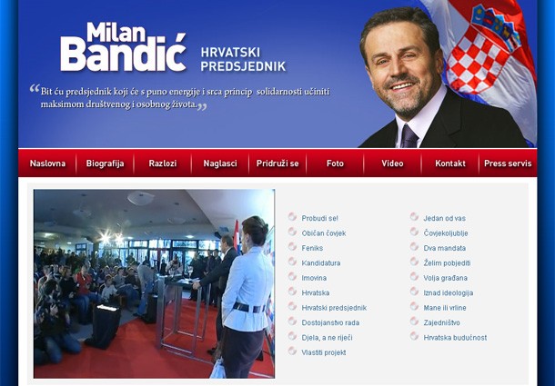 Prije koju godinu, web stranicu za predsjedničku kandidaturu Milana Bandića ocijenili bismo dobrom, no obzirom da se konkurencija znatno poboljšala, ovaj će put ocjena biti samo prolazna. Sve je tu: novosti vezane uz kandidaturu, Bandićeva biografija, program (iako ne najkoherentnije izražen), a za pohvalu je i isticanje Bandićevog profila na društvenim mrežama kao što su Facebook, Twitter i YouTube. Pokude idu pomalo zastarjelom dizajnu, slabo iskorištenom prostoru i video isječku koji se pokreće (zajedno sa zvukom) odmah nakon otvaranja stranice.