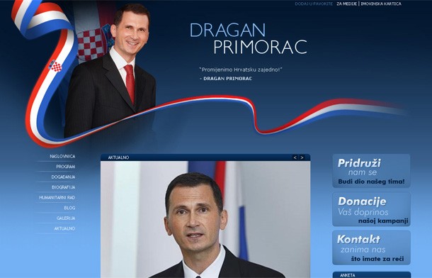 Osim ogromnog headera koji će pravi sadržaj stranice potisnuti negdje na polovicu ili čak na donju trećinu zaslona (ovisno o razlučivosti vašeg monitora), stranica Dragana Primorca prilično je korektna. Izbornik je pomalo sitan, ali cijenimo to što je sve na jednom mjestu, a od sadržaja možemo izdvojiti blog: ideja je odlična, štoviše smatramo da bi to trebao biti standard za današnje političare, no zasad je tu svega jedan kratki tekst o pokretanju kandidature. Znamo da je stranica pokrenuta tek nedavno, pa se nadamo da će u budućnosti tekstova na blogu biti više. Spomenimo još jedan detalj: stranica Dragana Primorca, uz onu Ive Josipovića, jedina ima svoj favicon (malena ikona koja se pojavljuje u adresnoj traci web preglednika).