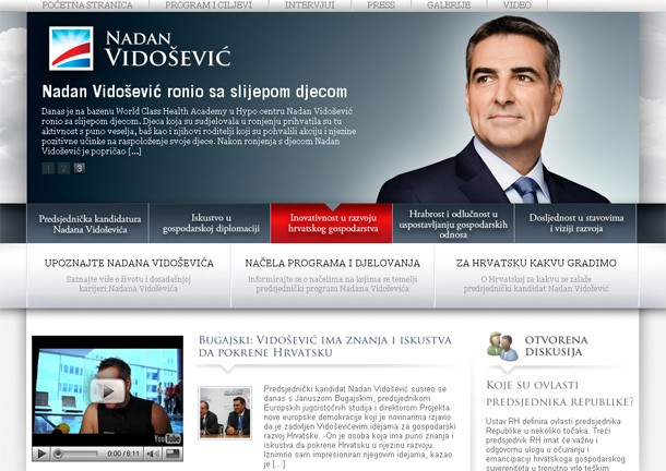 Nadan Vidošević, bez puno sumnje, ima najbolju web stranicu od svih predsjedničkih kandidata. Sadržajno i konceptualno, ona je tu negdje sa stranicom Ive Josipovića, no dizajn je još za jednu stepenicu bolji. Tu su još mnogi pozitivni detalji: primjerice, ispod svake vijesti nalaze se linkovi pomoću kojih je možete podijeliti s prijateljima na Facebooku, Twitteru ili MySpaceu. Hvalimo i okvir koji prikazuje Vidoševićeve prijatelje na Facebooku, kao i korištenje domaće mikroblogerske mreže Zrikka. Zgodna je i rubrika ‘Lovačke priče’ u kojoj Vidošević demantira (ne ulazimo u sadržaj, no ideja je odlična) negativne glasine koje se vezuju uz njegovo ime. Sa svih aspekata, riječ je o najkvalitetnijoj i najpromišljenijoj web stranici koju smo vidjeli u nekog našeg političara, pa tako i u onih koji sudjeluju na predsjedničkim izborima.