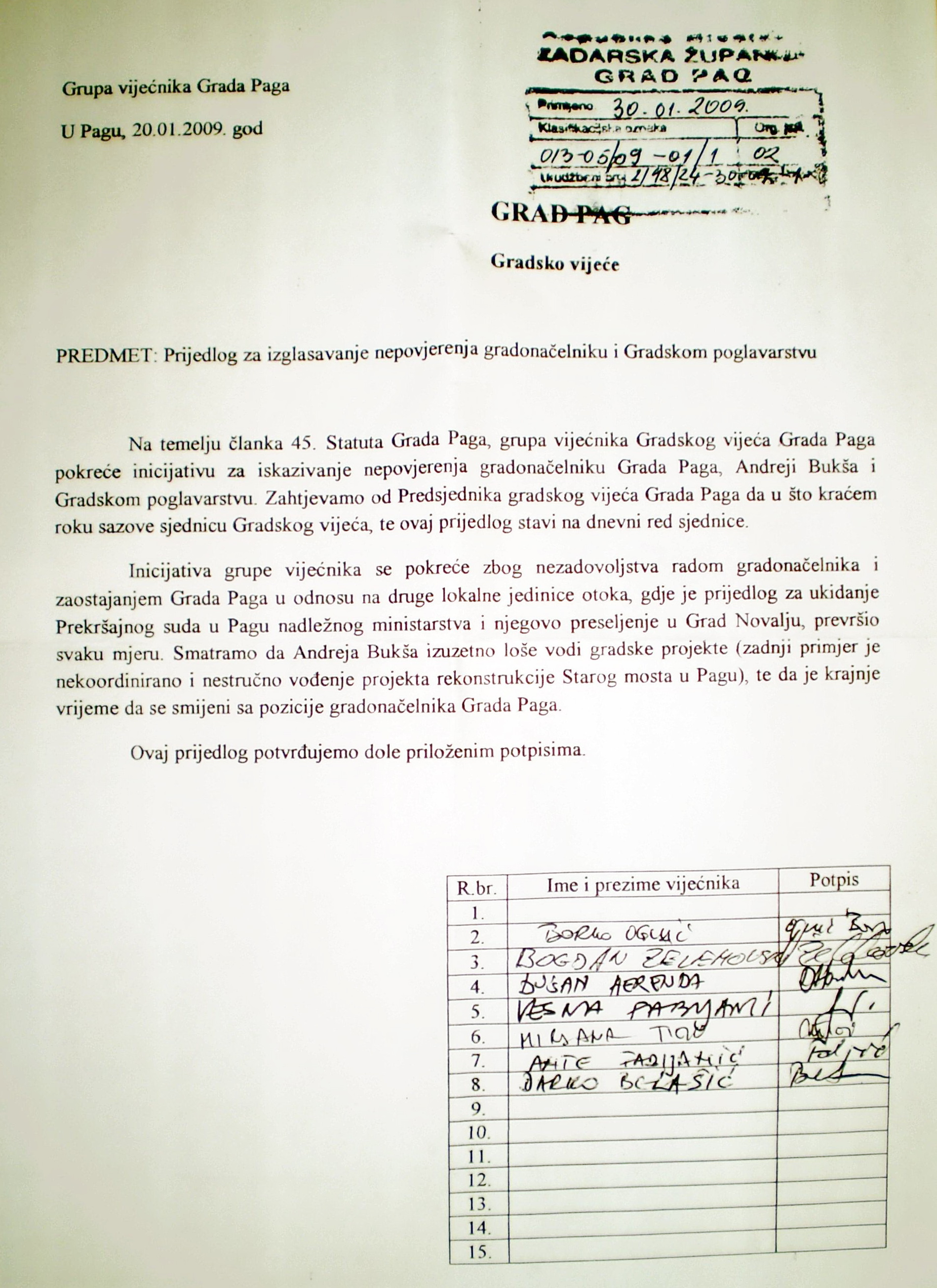 U obrazloženju navode kako su nezadovoljni radom gradonačelnika i zaostajanjem Grada Paga u odnosu na druge lokalne jedinice otoka, a prijedlog nadležnog ministarstva za ukidanje Prekršajnog suda u Pagu i njegovo preseljenje u Grad Novalju smatraju činom koji je prevršio svaku mjeru.