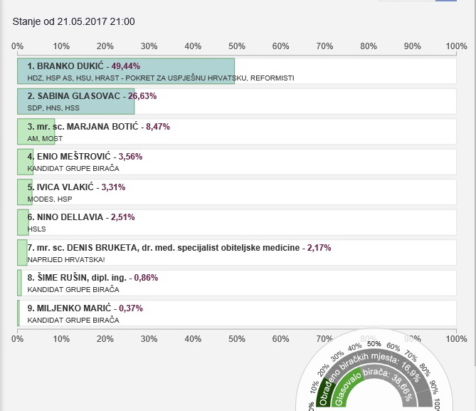 Glasovanju je pristupilo 38,66 posto upisanih birača a nakon obrađenih 16,9 biračkih mjesta u vodstvu za gradonačelnika Grada Zadra nalazi se Branko Dukić (HDZ) s 49,44 posto glasova, na drugom mjestu je Sabina Glasovac (SDP) s 26,63 posto glasova.