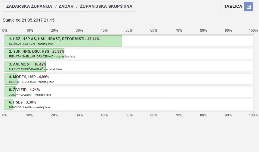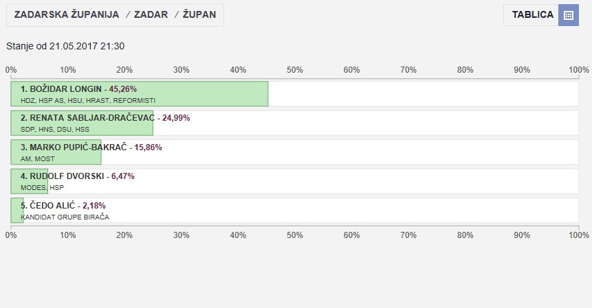 Glasovanju je pristupilo 39,81 posto upisanih birača a nakon obrađenih 30,99 biračkih mjesta u vodstvu za župana Zadarske županije nalazi se Božidar Longin (koalicija oko HDZ-a) s 45,26 posto glasova, na drugom mjestu je Renata Sabljar Dračevac (koalicija oko SDP-a) s 24,99 posto glasova i ako se nešto bitnog ne promijeni tu je moguć drugi krug izbora 4. lipnja.