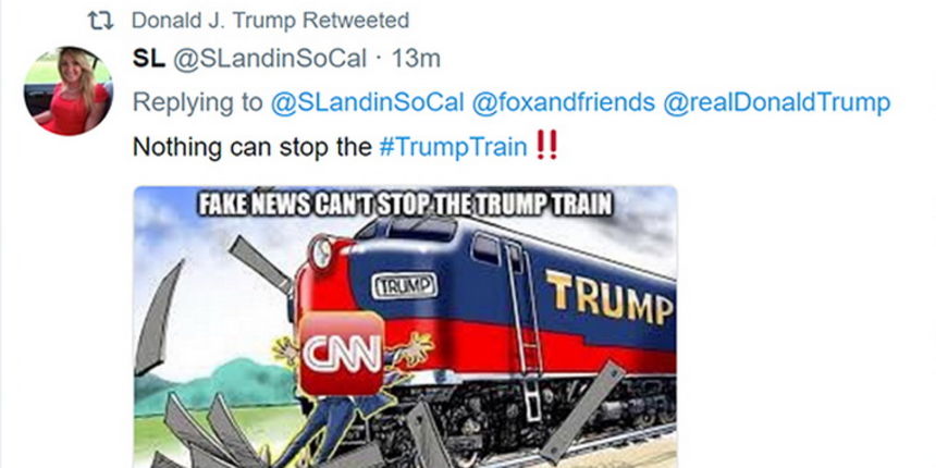Američki predsjednik Donald Trump postavio je na Twitteru karikaturu na kojoj vlak udara reportera CNN-a, tri dana nakon što je bijeli rasist automobilom pregazio ženu na desničarskom okupljanju.