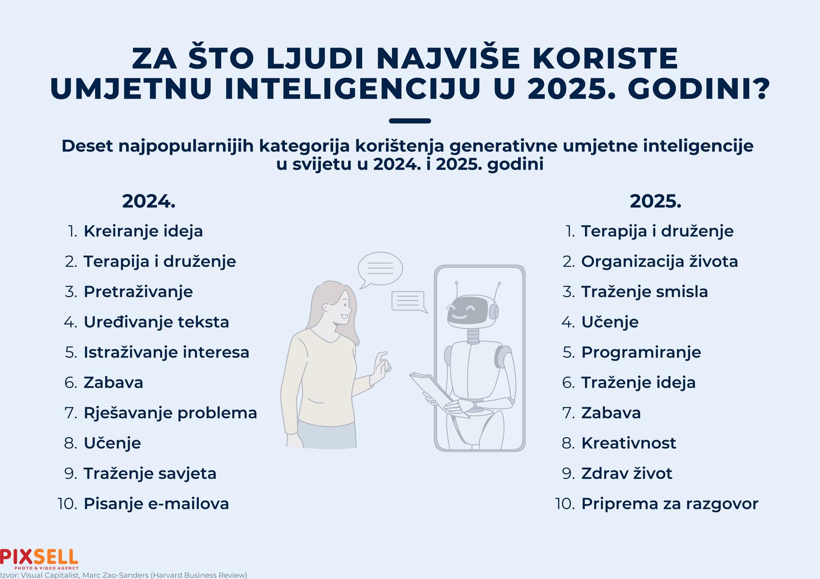 Prema najnovijim podacima, najčešća upotreba generativne AI bit će u području terapije i druženja, dok su organizacija zivota i traženje smisla novi prioriteti korisnika.