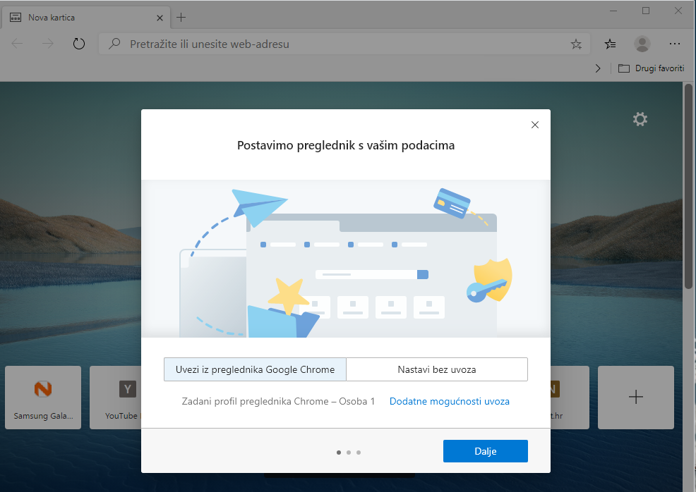 Pri prvom pokretanju Microsoftovog novog Edge web preglednika bit će vam ponuđeno nekoliko opcija za postavljanje početnih opcija. Prva je postavljanje preglednika s vašim podacima .