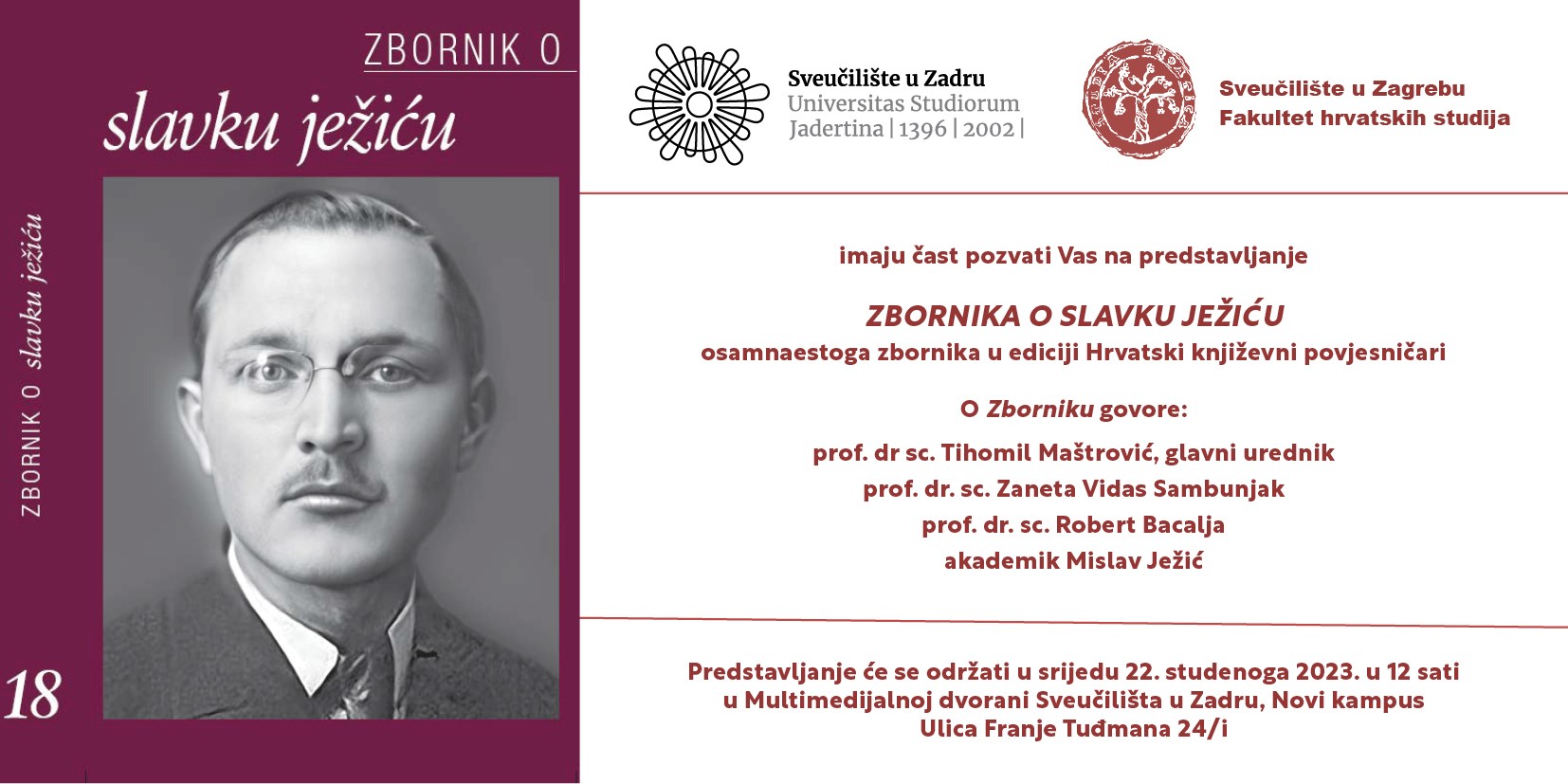U srijedu, 22. studenoga u 12 sati u multimedijalnoj dvorani Sveučilišta u Zadru, Novi kampus, Ulica Franje Tuđmana 24i, bit će predstavljen Zbornik o Slavku Ježiću, osamnaesti zbornik u ediciji Hrvatski književni povjesničari