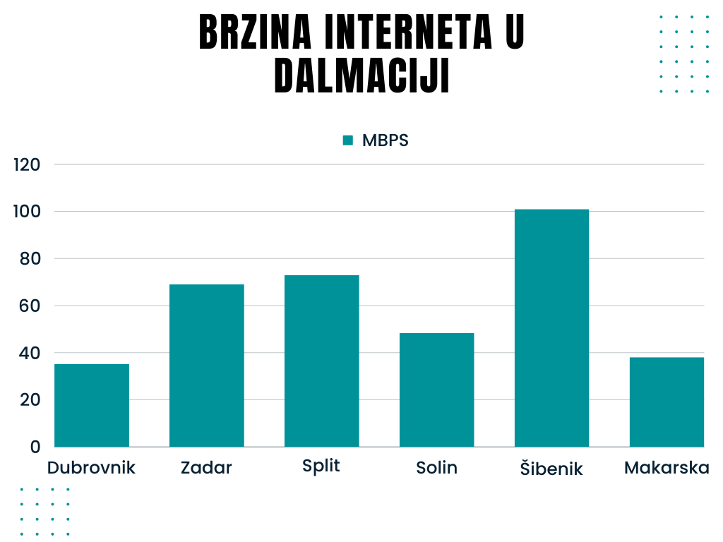 Naime, Šibenik ima prosječnu brzinu od 101.21 MBPS što je veoma blizu Zagrebu sa 134 MBPS, a Dubrovnik je na samome dnu s 35.23 MBPS.