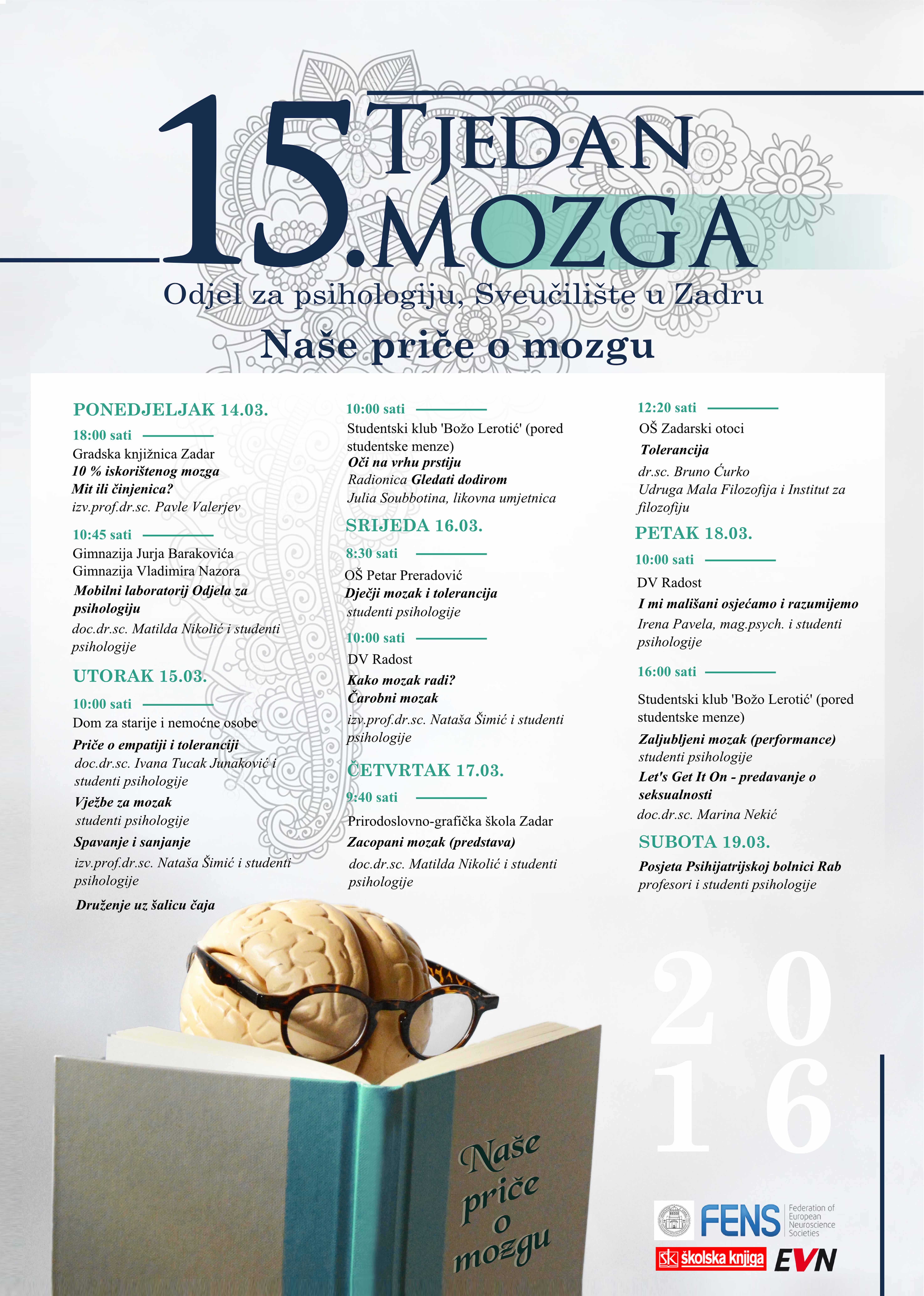Dio recentnih istraživanja mozga bit će predstavljen široj javnosti od 14. do 20 ožujka tijekom svjetske i europske akcije pod nazivom Tjedan mozga (Brain Awareness Week). Kampanja se 15. put održava u Hrvatskoj, gdje će diljem zemlje biti održana predavanja, radionice i tribine namijenjene svim uzrastima i razinama školske spreme, od rane školske dobi do sveučilišta.