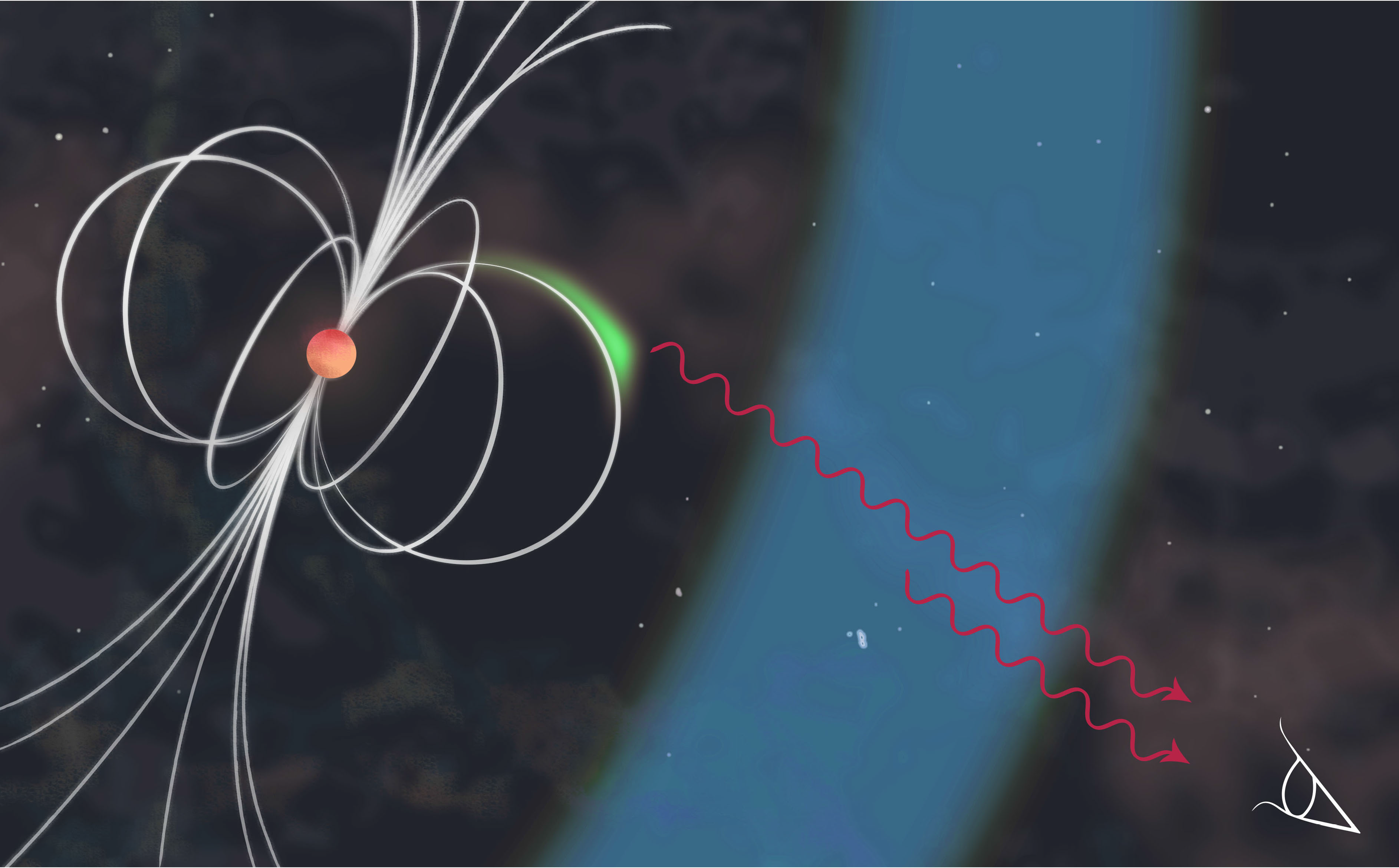 Neutronska zvijezda (crvena sfera) sa snažnim magnetskim poljem (bijele linije) rotira oko svoje osi 30 puta u sekundi te u okolni prostor izbacuje elektrone ultrarelativističkih brzina. Zeleno i plavo osječeni dijelovi označavaju područja gdje se elektroni ubrzavaju i koja bi trebala biti područja emisije detektiranih fotona. Zelena zona nalazi se u blizini magnetosfere, a plava zona bi mogla biti udaljena oko 100 000 km od pulsara. (Ilustracija: Patricia Carcelén Marco)