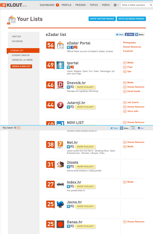 eZadar je među odabranim medijima i nakon današnje promjene algoritma zadržao prvo mjesto iako je u odnosu na prethodni, jutošnji skor izgubio 3 poena, tportal je drugi a današnjim izmjenama algoritma skor mu je pao za 8 poena. Dnevnik.hr je ostao na trećem mjestu a Klout score mu je pao za 9 poena.