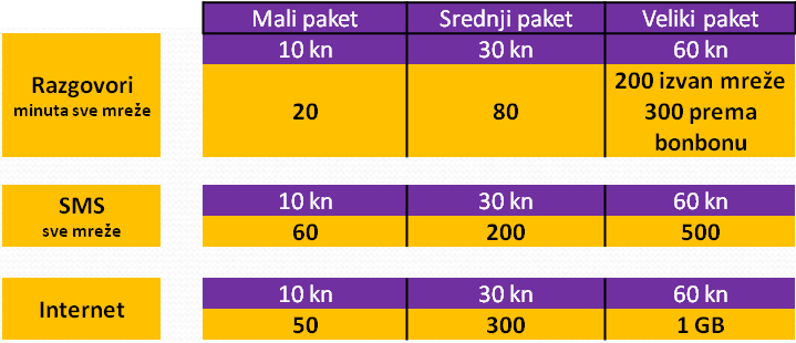 U internet paketima BonBon nudi 50 ili 500 MB te 1 GB, a u paketima za SMS nudi 60, 200 ili 500 poruka prema svim mrežama. Paketi besplatnih minuta sadržavaju po 20, 80 ili 200 minuta izvam mreže, a onaj naskuplji sadržava i 300 minuta unutar mreže.