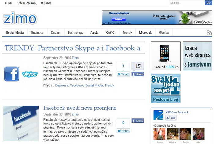 ZIMO je blog o najnovijim vijestima iz svijeta društvenih mreža, multimedije i dizajna. Ako to malo raščlanimo, blog pokriva vijesti iz IT (information technolgy) sektora, nova glazba, recenzije albuma, i sve što se može povezati uz dizajn.