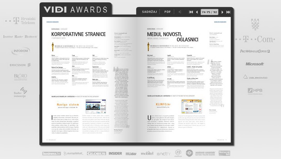 Kompletan Vidi Awards službeni katalog zajedno s popisom i opisima svih Vidi Web Top 100 i Vidi e-novation dobitnika za godinu 2008. možete pročitati u cjelovitom digitalnom obliku na web adresi: www.vidi.hr/katalog/.