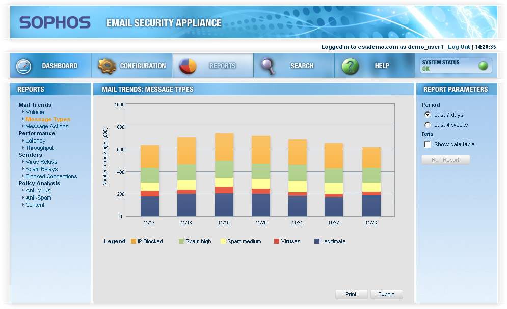 Email Security appliance ili ES4000 nagrađen je od ” West Coast Labs Checkmark” za stopostotnu detekciju virusa tijekom nezavisnog testiranja na slobodi. Uz ovaj Sophosov uređaj, nagrađeno je i Sophosovo antivirusno rješenje, sa “West Coast Labs Checkmark” (Level 1 i Level 2) i to također za stopostotnu detekciju i čišćenje virusa na slobodi.