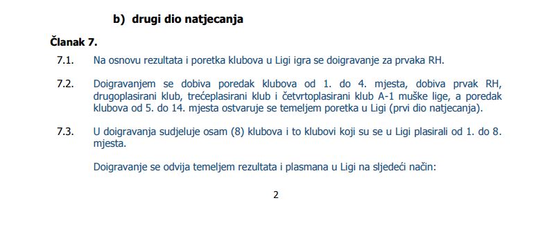 Prema novim propozicijama natjecanja, koje je 27. prosinca potpisao Stojko Vranković, u članku 7.2 piše sljedeće: Doigravanjem se dobiva poredak klubova od 1. do 4. mjesta, dobiva prvak RH, drugoplasirani klub, trećeplasirani klub i četvrtoplasirani klub A-1 muške lige, a poredak klubova od 5. do 14. mjesta ostvaruje se temeljem poretka u Ligi (prvi dio natjecanja).