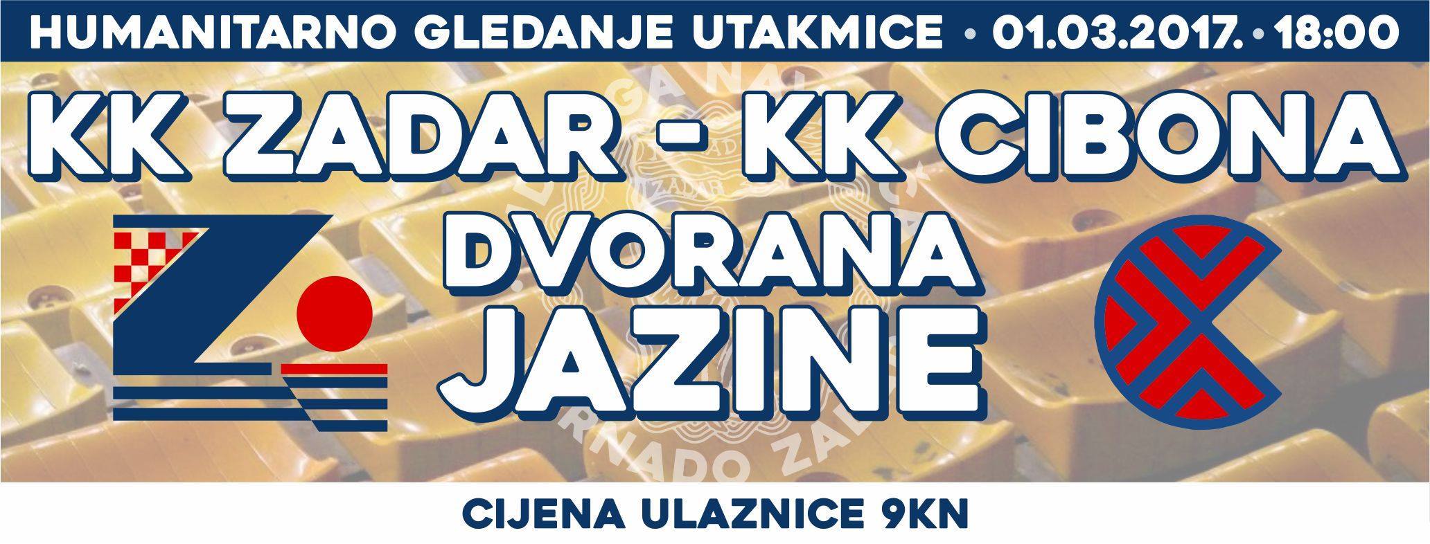Udruga navijača Tornado Zadar poziva navijače KK Zadar i sve sugrađane kojima je stalo do Zadra i njihova kluba na humanitarno gledanje košarkaške utakmice između KK Zadar i KK Cibone, u srijedu 1. ožujka s početkom u 18 sati u legendarne Jazine.