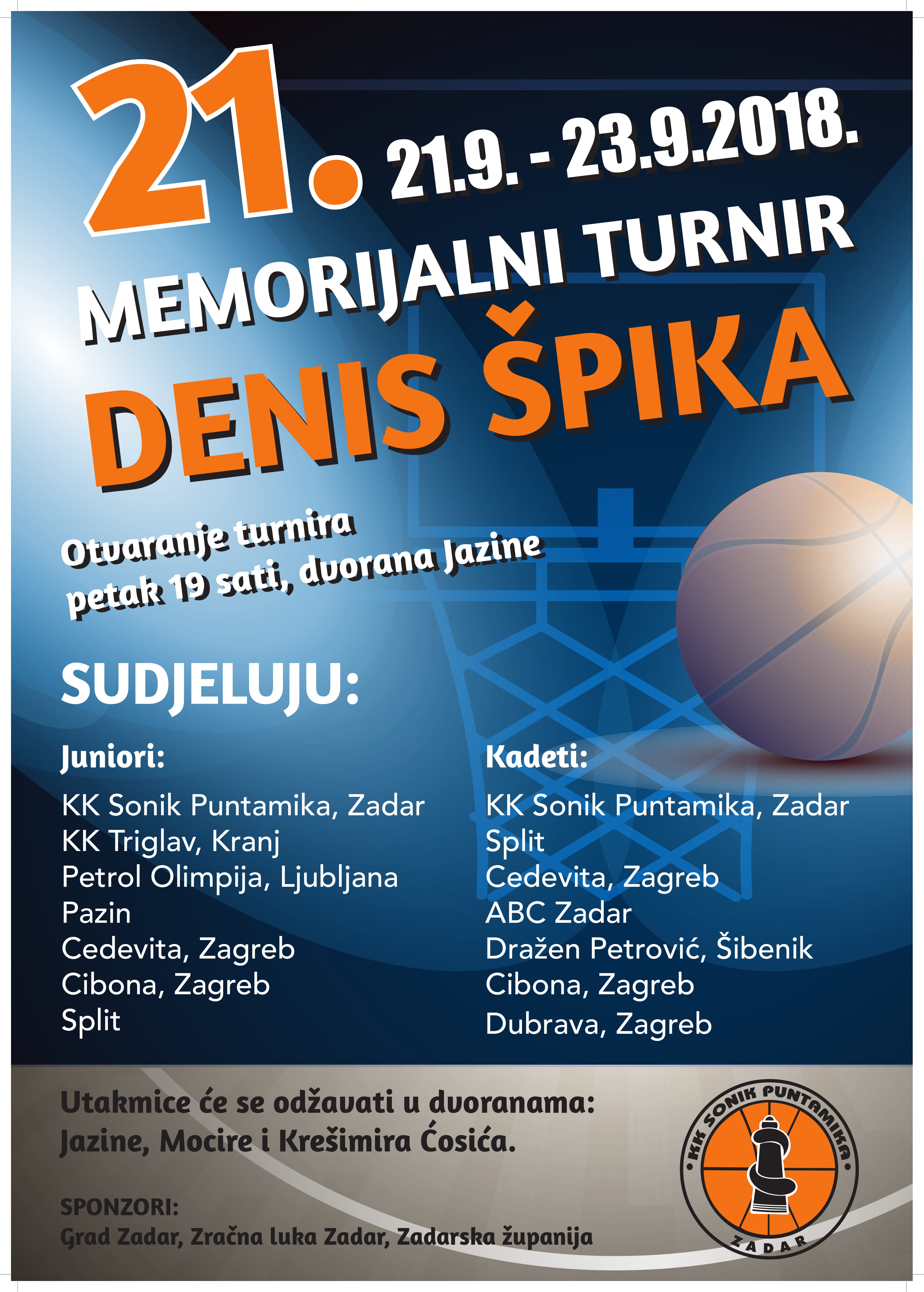 Dokazana sjajna organizacija i iznimno popularni događaj koji će uveličati brojni gosti, prijatelji kluba i košarke, predstavnici Hrvatskog košarkaškog saveza, tradicija koja traje preko 20 godina, budućnost hrvatske košarke na jednom mjestu, sve su to preduvjeti za 21. izdanje Međunarodnog memorijalnog turnira za kadete i juniore Denis Špika koji će se održati od 21.do 23. rujna u zadarskoj dvorani Jazine te u dvoranama Krešimira Ćosića i Mocire.