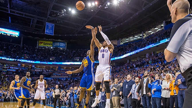 Russell Westbrook je tricom u zadnjoj sekundi donio domaću pobjedu Oklahoma Cityju protiv Golden Statea 113-112. Westbrook (šut iz igre 10-25) je postigao 34 koša, osobni rekord sezone, imao je i 7 asistencija. Kevin Durant je dodao 25 koševa. Oklahoma City (11-3) je upisao šestu uzastopnu pobjedu u sezoni, a pred svojim navijačima je i dalje neporažen (8-0). Kod Warriorsa (9-8) je najbolji bio Spephen Curry s 32 koša, 11 skokova i 5 dodavanja za koš, dok je Harrison Barnes postigao 26 koševa, što mu je osobni rekord karijere.