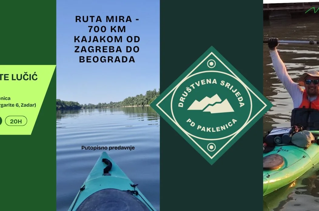 U srijedu 05.11.. u 20h, u sklopu programa “Društvene srijede”, u prostorijama Planinarskog društva Paklenica odžati će se putpisno predavanje Ante Lučića : Ruta mira – kajakom 700 km od Zagreba do Beograda