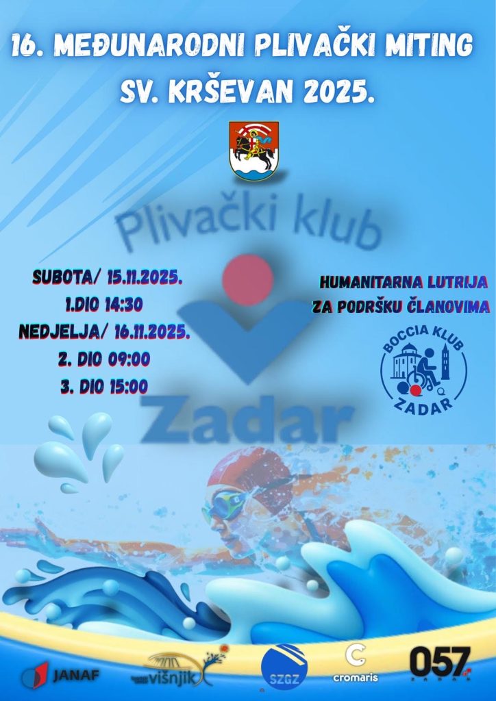 Zadar će i ove godine biti središte vrhunskog plivanja i sportskog zajedništva. U organizaciji Plivačkog kluba Zadar, 15. i 16. studenoga 2025. održat će se 16. Međunarodni plivački miting „Sveti Krševan“, tradicionalno natjecanje koje okuplja mlade plivače iz Hrvatske i inozemstva. Događaj će se održati na bazenu Športskog centra Višnjik, a uz bogat sportski program, miting i ove godine nosi posebnu humanitarnu notu.