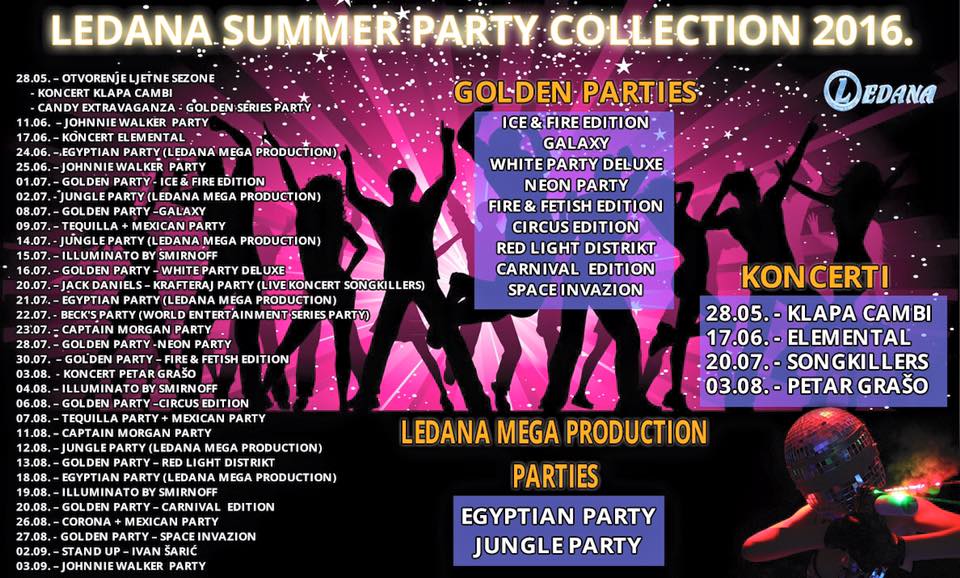 Sve započinje u subotu, 28. svibnja uz koncert klape Cambi, a najavljeni su nastupi i grupe Elemental, Petra Graše, Songkillersa, Ivana Šarića, uz posebne večeripod nazivom “Golden parties” i večeri u znaku Egipta i/ili džungle.