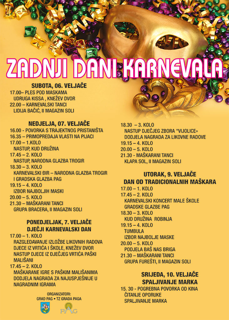 Organizatori – Grad Pag i Turistička zajednica Grada Paga pozivaju sve ljubitelje karnevala iz svih mjesta s otoka Paga , Zadra i okolice da dođu na Paški zimski karnevala – karneval s najdužom tradicijom u Zadarskoj županiji.