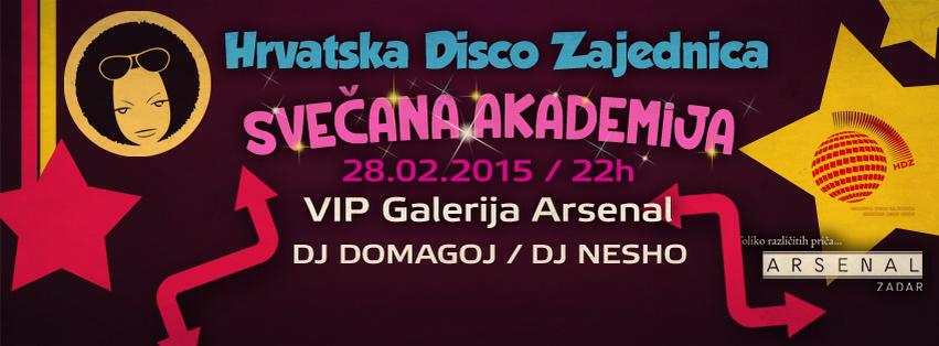 U subotu, 28. veljače, s početkom u 22 sata, u jedinstvenom prostoru Arsenalove “VIP Galerije”, zadarski akademik plesne glazbe – DJ Domagoj će vas u suradnji s osnivačem Hrvatske Disco Zajednice (HDZ) – DJ Neshom, povesti na nezaboravno putovanje – od samih početaka u “Bašti” sve do posljednjih disco izdanja 2015. godine.