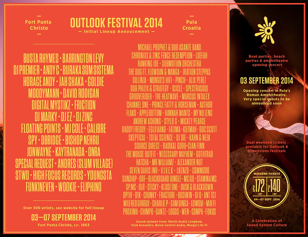 Slaveći fuziju dub, reggae, hip-hop, drum ‘n’ bass, garage, house i srodne glazbe na 12 dnevnih i noćnih pozornica širom poluotoka i 40 boat partyja, Outlook festival od 3. do 7. rujna, dovodi preko 300 izvođača, spajajući tako glazbene legende s novom generacijom glazbenika i nadolazećih talenata.