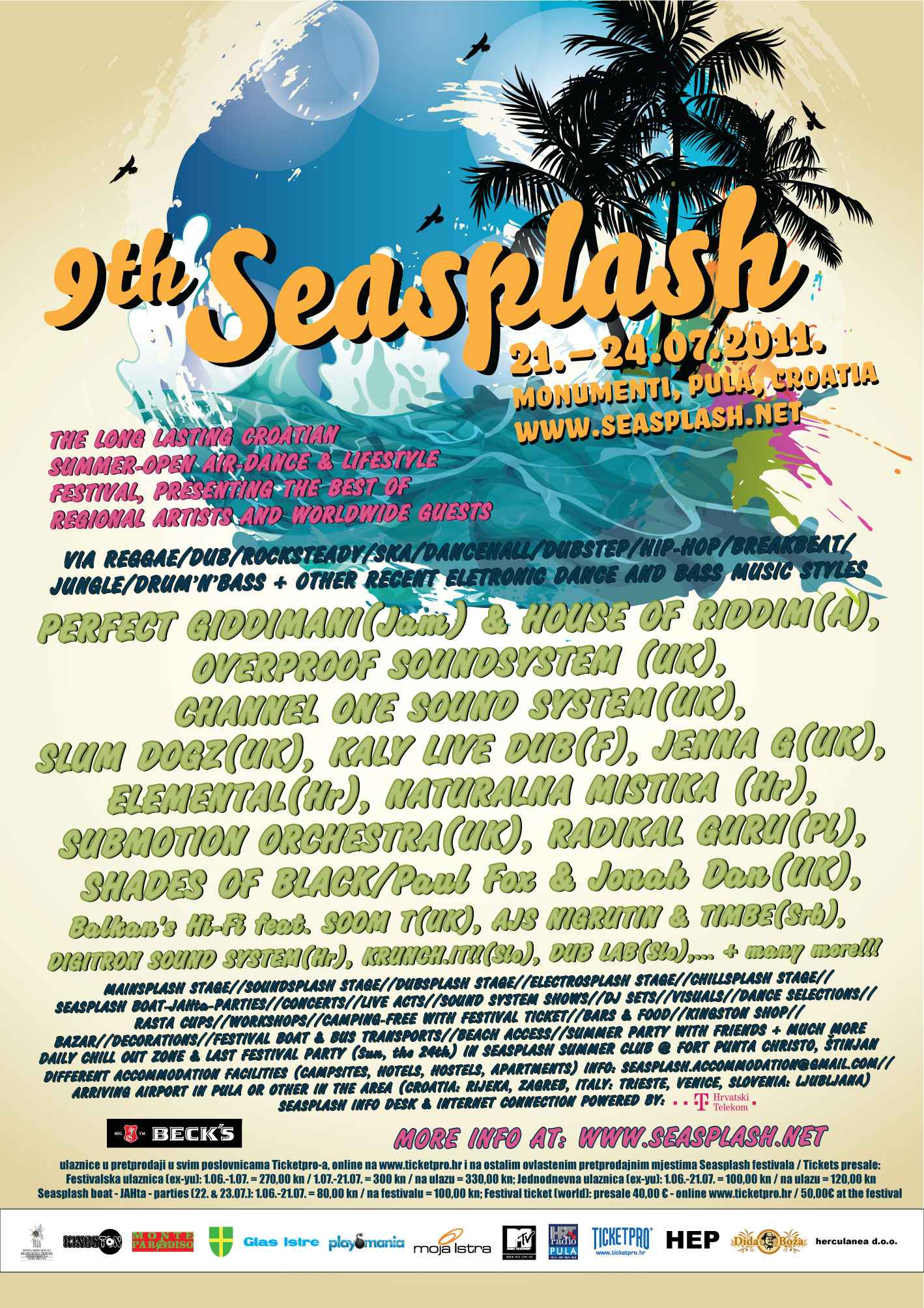 Perfect Giddimani (direktno s Jamajke, jedan od trenutnih reggae superzvijezda, u pratnji austrijskog benda House Of Riddim, renomirani back up sastav koji je dosad pratio mnoge reggae/dancehall velikane), Kaly Live Dub (uz prošlogodišnje goste High Tone jedan od najprogresivnijih francuskih i europskih dub bendova uopće), Channel One Sound System, Shades Of Black/Paul Fox & Jonah Dan, Radikal Guru (bastioni engleske, poljske, tj. europske dub & sound system kulture), prve dame engleskog drum’n’bass-a, odnosno škotskog dubstep/ragga/grime-a Jenna G i Soom T, Submotion Orchestra (jedan od najperspektivnijih dub/dubstep/trip-hop bendova), SlumDogz (sve popularniji engleski dubstep/drumstep dvojac sa Circus rec.),…, a Seasplash festival je posebno ponosan što između ostalih, nakon 8 godina održavanja, ima mogućnost ugostiti plejadu domaćih i regionalnih izvođača, na sceni koja se razvija i rapidno raste, od već scenski dokazanih (Elemental, Ajs Nigrutin & Timbe,…), do novih imena čije vrijeme tek nadolazi (Chakka & Popay feat. I-Tall Riddim Band, Waitapu, Dubble,), kao i čitav niz inozemnih i domaćih live act, sound system i DJ nastupa. Festival tako i nadalje zadržava i razvija svoj međunarodni karakter.