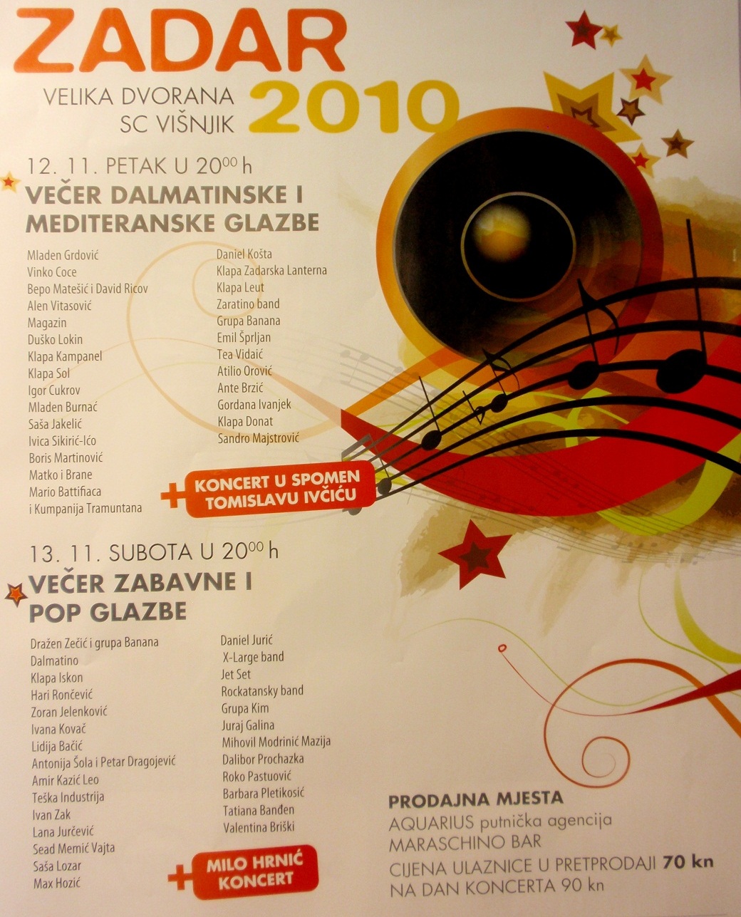 Vinko Coce, Mladen Grdović, Bepo Matešić i David Ricov, Alen Vitasović, Magazin, Duško Lokin, Klapa Kampanel, Klapa Sol, Igor Cukrov, Mladen Burnać, Saša Jakelić, Ivica Sikirić – Ico, Boris Martinović, Matko i Brane, Mario Battifiaca i Kumpanija Tramuntana, Daniel Košta, Klapa Zadarska Lanterna, Klapa Leut, Zaratino Band, Grupa Banana, Emil Šprljan, Tea Vidaić, Atilio Orović, Ante Brzić, Gordana Ivanjek, Klapa Donat, Sandro Majstorović te na kraju i koncert zadarskih izvođača u spomen Tomislavu Ivčiću: