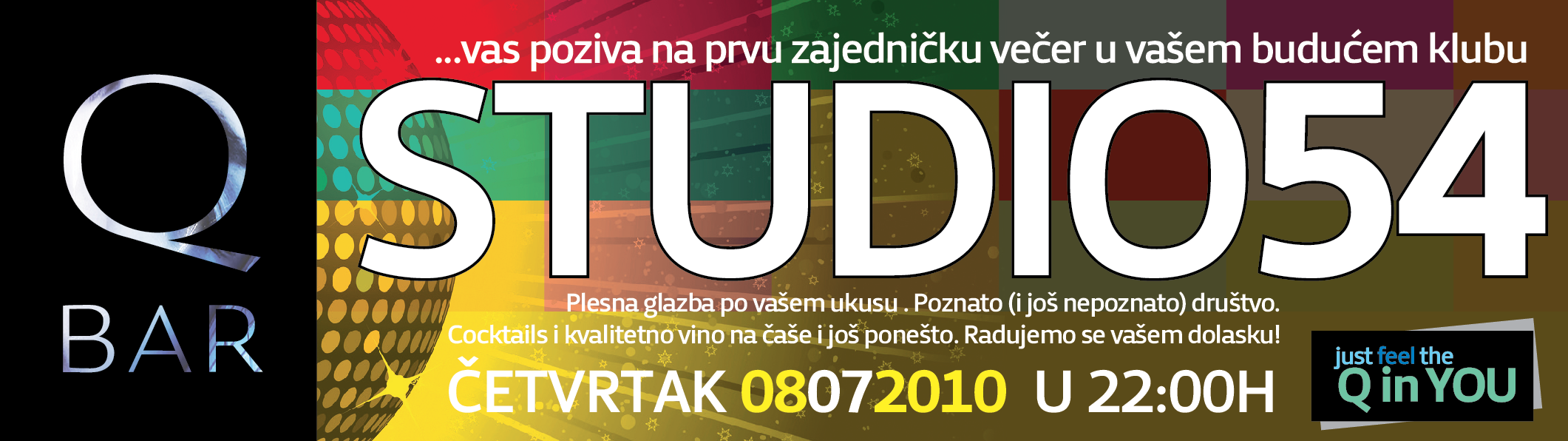 Q bar vas poziva na zabavu uz ritmove Studia 54 u četvrtak, 8. srpnja 2010. godine s početkom u 22 sata. Kao i svaki slijedeći četvrtak moći ćete se zabaviti u Q-baru uz svima dobro poznate disco hitove.