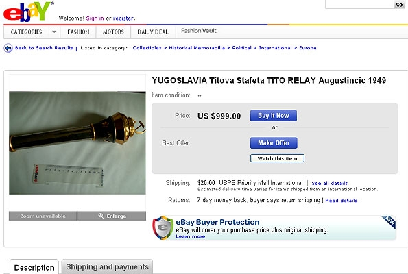 Na rođendan Josipa Broza Tita doznaje se kako se na najpoznatijem online sajmu, eBayu, prodaje jedna od Titovih štafeta, koje su se tradicionalno nosile diljem bivše Jugoslavije za Dan mladosti, donosi danas.hr .