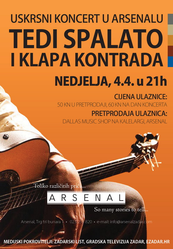ARSENAL ZADAR, 4.travnja 2010., 21 h USKRSNI KONCERT: TEDI SPALATO I KLAPA KONTRADA Cijena ulaznice: 50 kuna u pretprodaji (Arsenal, Dallas music shop), 60 kuna na dan koncerta