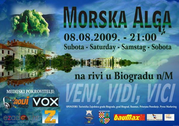 Večeras s početkom u 21 sat na biogradskoj obali Kralja Petra Krešimira IV po prvi put održat će se zabavno-edukativna manifestacija “Morska alga”, pod pokroviteljstvom Grada Biograda i TZ grada Biograda.