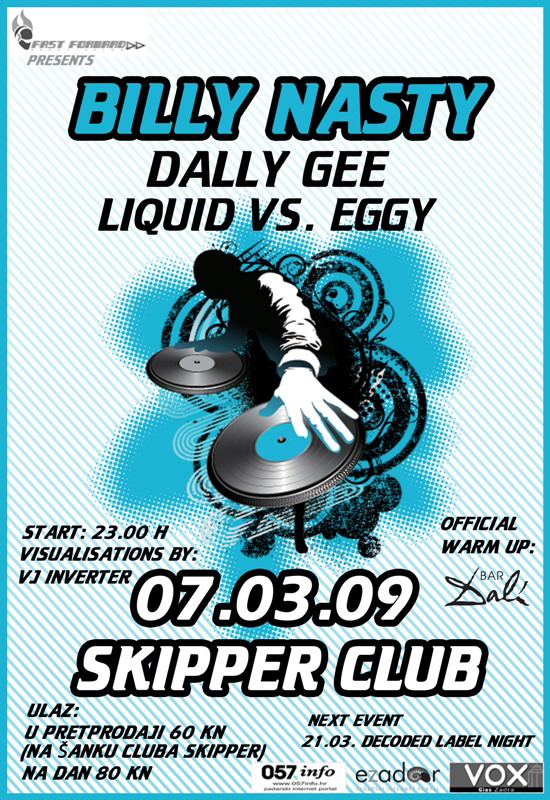 U klubu Skipper 7. ožujka 2009. godine, kao vjesnik proljeća, najavljen je veliki DJ i producent Billy Nasty, legenda britanske elektronske scene. Čast nam je ugostiti takvu jednu poznatu ličnost iz svijeta glazbe.