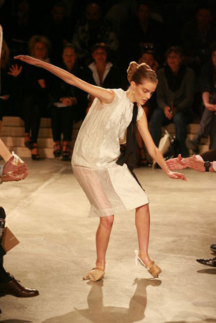Scenarij se ponovio i u ‘sterilnijem’ dijelu kolekcije kada je manekenka uprizorila iščašenje oba zgloba i u konačnici završila na podu, tako da su joj kolegice morale pomoći da ustane.