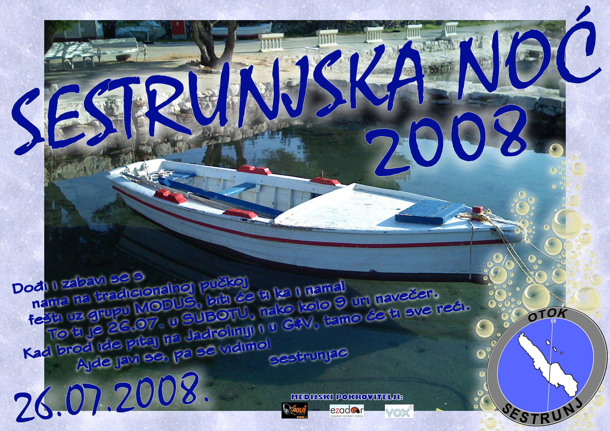 Već desetak godina tradicionalno se na otoku Sestrunju održava manifestacija pod imenom “Sestrunjska noć”. Pučka fešta ove će se godine održati u subotu 26. srpnja, a sve posjetitelje će zabavljati zadarska grupa Modus.