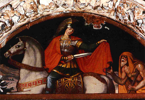 Kad je imao nešto više od petnaest, Martin je na konju, u vojničkoj opremi na kojoj se posebno isticao veliki crveni ogrtač, jahao dok je studeni vjetar najavljivao dolazak zime. Iznenada, uz rub ceste, pojavi se neki stari siromah, sav promrzao, u poderanim krpama. Starac je tresući se pružio ruku za pomoć. Martin se dosjetio: mačem je presjekao polovicu svoga crvenog plašta i njime zaogrnuo promrzlog starca. Te noći Martin je prema predaji blaženo usnuo, a u snu mu se javio Isus te mu zahvalio što ga je zaogrnuo polovicom svog ogrtača.