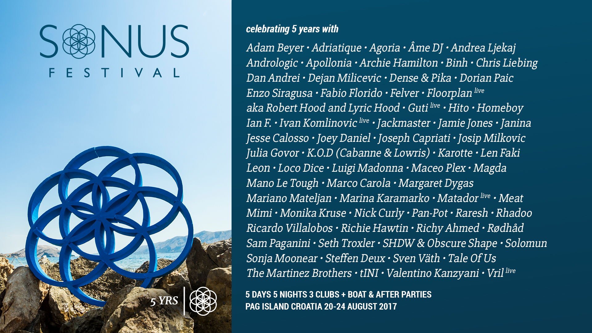 Više od 60 imena svjetske elektroničke scene nastupit će na jubilarnom petkom izdanju Sonus festivala. Uz već zadivljujući program, još imena se pridružilo jednom od deset najboljih svjetskih techno festiivala koji će se ove godine održati od 20. do 24. kolovoza u klubovima Papaya, Aquarius i Kalypso na plaži Zrće.
