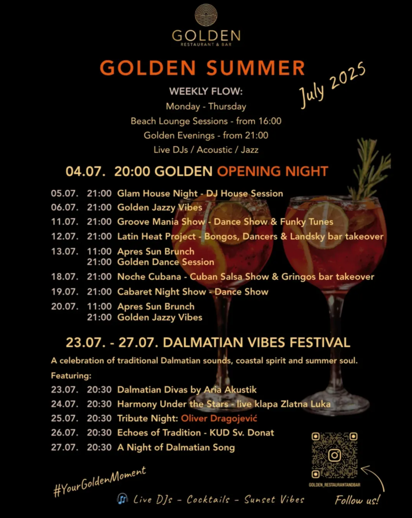 Od 23. do 27. srpnja Golden će biti oaza za sve ljubitelje mediteranskih melodija, uz nastupe Aria Akustik, klape Zlatna luka, KUD Sv. Donat, a istaknut ćemo i posebnu Tribute večer posvećenu Oliveru Dragojeviću.