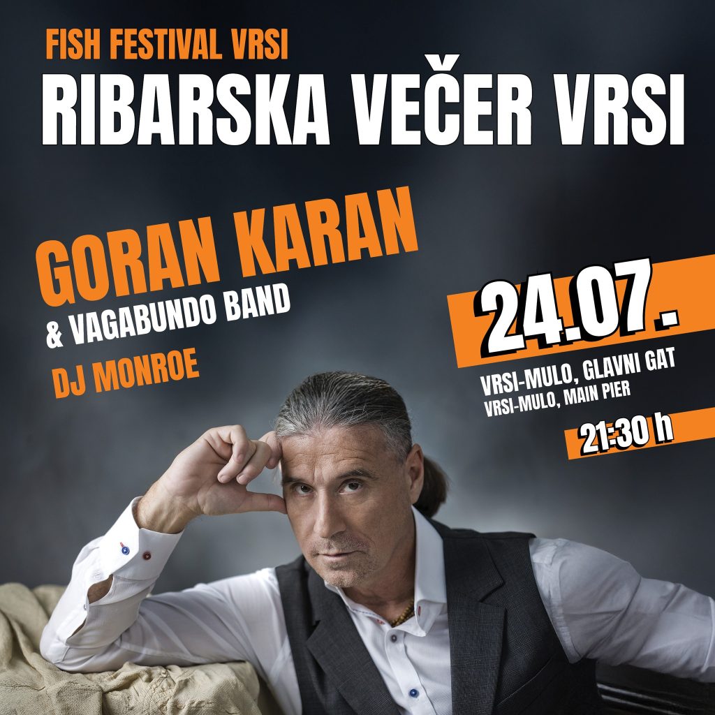 Goran Karan, poznat po snažnim baladama i emotivnom vokalu, dolazi u Vrsi s Vagabundo bendom, s kojim već godinama osvaja publiku diljem Lijepe Naše. Njihov nastup donosi spoj dalmatinske i mediteranske glazbe, ispunjen pjesmom, toplinom i iskrenim emocijama.
