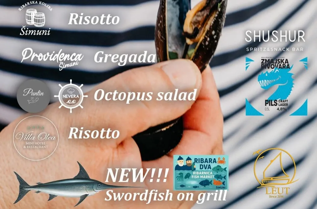 Na fešti će se pripremati razna riblja jela – brudet, rižot, gregada i salata od hobotnice – u izvedbi šimunskih ugostitelja: Didova kuća, Ribarska koliba Providenca, Puntin, Nevera, Leut, Villa Olea i Shushur.