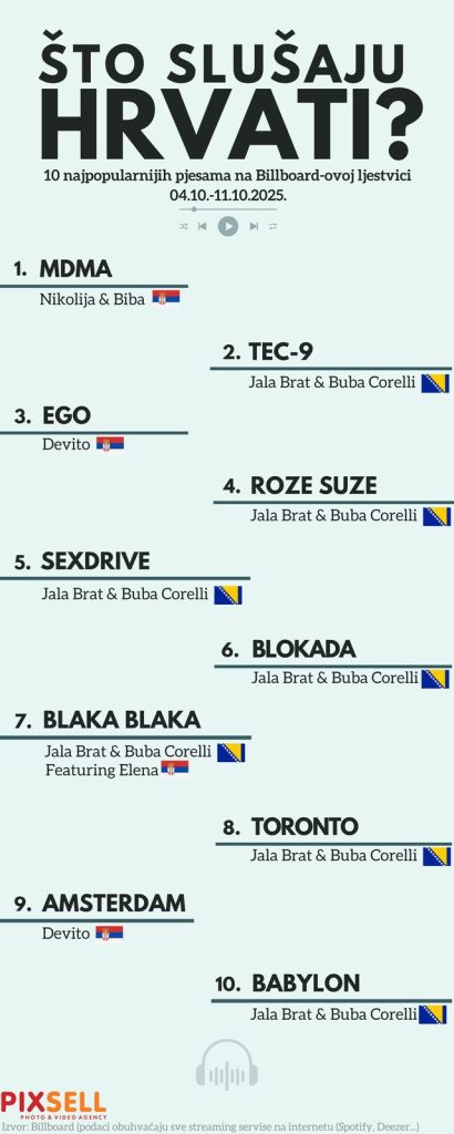 Prema Billboardovoj ljestvici za razdoblje od 4. do 11. listopada 2025., hrvatske top liste preplavili su regionalni izvođači. Na prvom mjestu nalazi se pjesma “MDMA” koju izvode Nikolija & Biba iz Srbije.