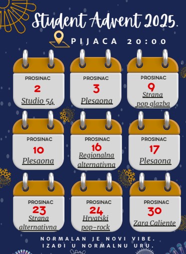 Utorci i srijede rezervirani su za Student Advent, namijenjen studentima, profesorima, djelatnicima i svima koji žele uživati u glazbi koju rijetko mogu čuti u današnjim klubovima.