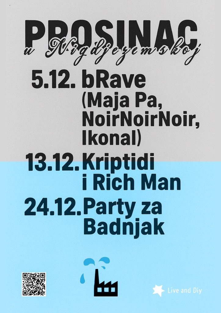 Nigdjezemska još jednom potvrđuje svoju ulogu – ne samo kao prostor za koncerte, već kao žarište zadarske subkulture, mjesto gdje se okupljaju kreativci, glazbenici, umjetnici i svi oni koji traže nešto drugačije. Prosinac je tek dodatna prilika da se ta energija osjeti u punom sjaju!