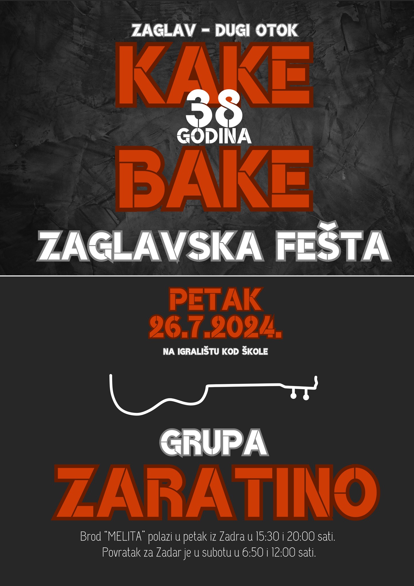 Pozivamo vas na tradicionalnu feštu Kake Bake na Zaglavu! U petak, 26. srpnja 2024., na igralištu pored škole, zabavljat će vas grupa Zaratino do ranih jutarnjih sati.