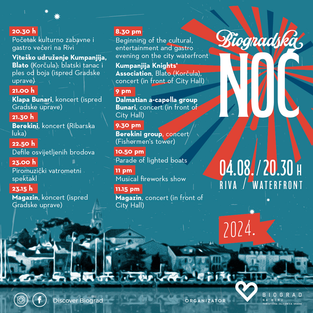 Biogradska noć 2024., tradicionalna turistička fešta i vrhunac biogradskog ljeta posvećena Danu pobjede i domovinske zahvalnosti održat će se večeras od 20.30 sati na Rivi u Biogradu na Moru.